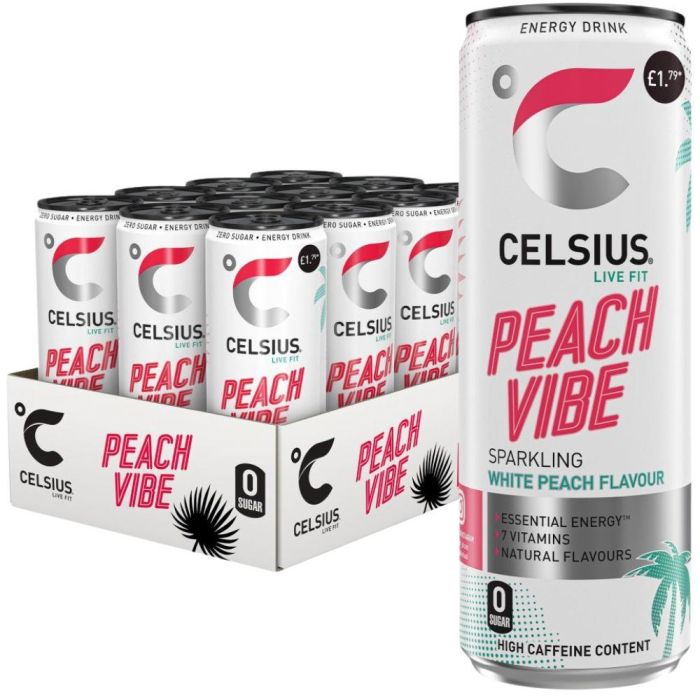 CELSIUS Peach Vibe White Peach Flavor Zero Sugar Sparkling Energy Drink ✨ Flavor & Sugar: CELSIUS Peach Vibe offers a White Peach flavor with zero sugar for those seeking a sugar-free sparkling energy drink. Contents & Pack This pack includes 12 cans, each containing 355ml. Ideal for maintaining energy levels throughout the day. Ingredients The drink contains caffeine and vitamins, helping to boost your energy. Suitable for those who need a pick-me-up. Usage Enjoy this CELSIUS Peach Vibe White Peach Flavor Zero Sugar Sparkling Energy Drink for a refreshing and energizing experience.