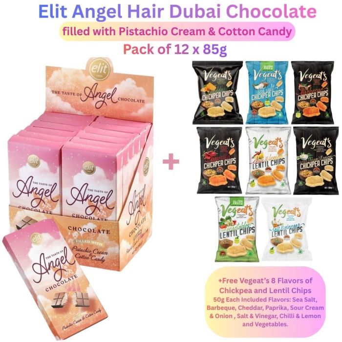 Indulge in the perfect sweet & savoury bundle with Elit Angel Hair Dubai Chocolate and FREE Vegeat’s Chickpea & Lentil Chips. This exclusive pack includes 12 x 85g Elit Angel Hair Dubai Chocolate bars, luxuriously filled with smooth pistachio cream and soft cotton candy, delivering a rich, indulgent chocolate experience inspired by Dubai’s finest flavours. To complete the bundle, enjoy FREE Vegeat’s 8-Flavour Chickpea & Lentil Chips (50g each) — a crunchy, plant-based snack selection made from chickpeas and lentils, offering bold flavours and satisfying texture. What’s Included 12 × Elit Angel Hair Dubai Chocolate Bars (85g each) Filled with pistachio cream & cotton candy FREE Vegeat’s Chickpea & Lentil Chips – 8 Flavours (50g each): Sea Salt Barbecue Cheddar Paprika Sour Cream & Onion Salt & Vinegar Chilli & Lemon Vegetables
