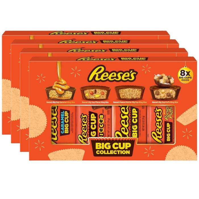 Title: Reese's Peanut Butter Big Cup King Size Selection Box - Pack of 32 (4 x 8 Big Cups) x 305g, Includes: King size, Puffs King Size, Caramel King Size & Pieces King size