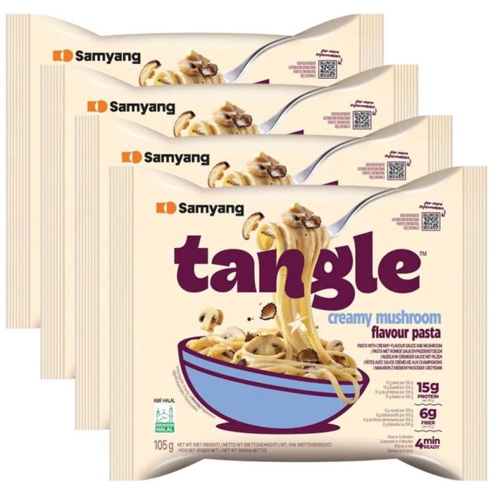 Samyang Tangle Creamy Mushroom Flavour Pasta Packaging: This product comes in a pack of 4, each containing 15g of pasta. Flavour: Enjoy a creamy taste with a delightful mushroom aroma. Usage: Perfect for those who love a creamy pasta with a hint of mushroom flavor. Key Features: Creamy Taste: The pasta offers a smooth, creamy texture. ️ Mushroom Aroma: Experience the pleasant mushroom aroma that enhances the flavor. Convenient Pack: With 4 packs of 15g each, it's ideal for easy serving. Product Information: Name: Samyang Tangle Creamy Mushroom Flavour Pasta. Quantity: 4 packs x 15g. Flavour: Creamy with mushroom aroma.