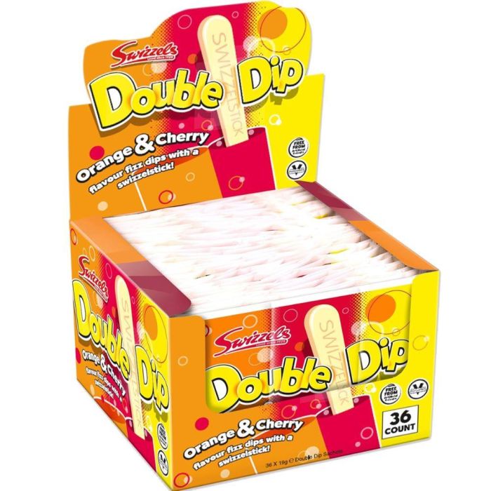 Swizzels Orange and Cherry Double Dip Stick Pack Details: This pack contains 36 x 19g Swizzels Orange and Cherry Double Dip Sticks. Product Type: These are Fizz Dips, for a refreshing treat. Included Item: Each stick comes with a Swizzlestick for easy enjoyment. Product Features Flavor: Enjoy the combination of Orange and Cherry flavors. Pack Size: The pack is conveniently sized at 36 sticks, each weighing 19g. Usage: Ideal for those who love fizzing dips. for Snacking: A great snack option for parties or gatherings. Refreshment: Provides a refreshing treat for any occasion.